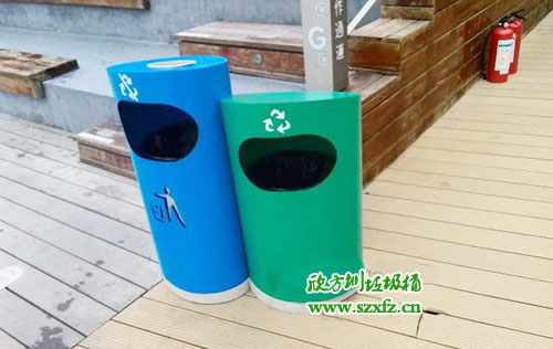 此款F182分類環保垃圾桶,前兩年在我司欣方圳定制過,為歡樂海岸繼續輸送垃圾桶。擺放在歡樂海岸風吹日曬幾百天了,依然看不出有啥變化,欣方圳垃圾桶的質量,就是這么牛。分類環保垃圾桶規格為790*380*900mm,采用304不銹鋼烤漆而成,造型獨特,外觀由兩個高矮不一顏色各異的圓形垃圾桶組成,其中綠色桶偏矮為可回收垃圾桶,藍色桶偏高為不可回收垃圾桶,整體精致美觀。