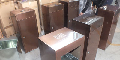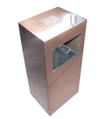 • 產品材質:采用不銹鋼鋼板拉絲咖啡色或玫瑰金制作而成,另產品可做四面大理石用鋼板螺絲固定于桶體,有內桶,方便提倒垃圾,桶頭煙灰盅可放白石子可清洗,鋼板經折彎沖壓一次性成型。產品一律用室外粉靜電噴塑,經過180°的高溫,延長垃圾桶使用壽命,顏色持久不變亮麗如新。