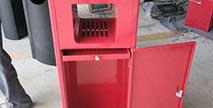 欣方圳鋼板沖孔室內單桶中國紅噴塑造型,側面開門以保證不影響美觀,也方便工人方便清理垃圾