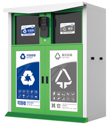 • 產品特點:智能垃圾分類回收箱分別回收紙張、塑料、金屬、玻璃、紡物、有害、廚余、其他等八種常見可回收再生資源。內置智能自動稱重模塊,后臺時刻檢測回收箱垃圾重量,滿溢自動停用功能并自動發送預警信息及時清運;帶感光燈控開關傍晚會自動開啟照亮功能;用戶身份識別系統,可追塑垃圾投放來源;后臺數據統計,積分兌換禮品。